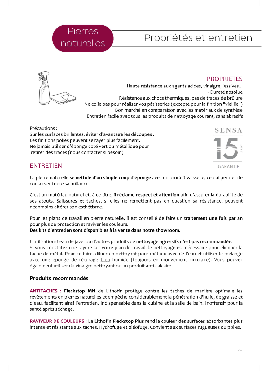 Pour maintenir l'éclat et la résistance de votre plan de travail, HM Déco recommande un traitement spécifique une fois par an. Ce traitement protège la pierre contre les taches et ravive sa couleur naturelle. Nos équipes peuvent vous fournir les produits nécessaires et vous guider dans leur application.