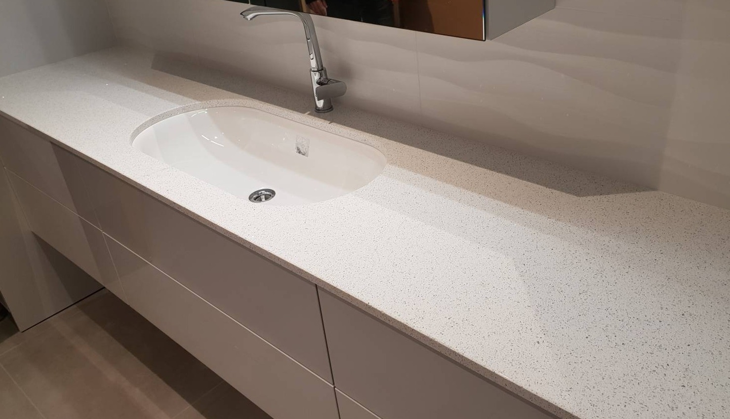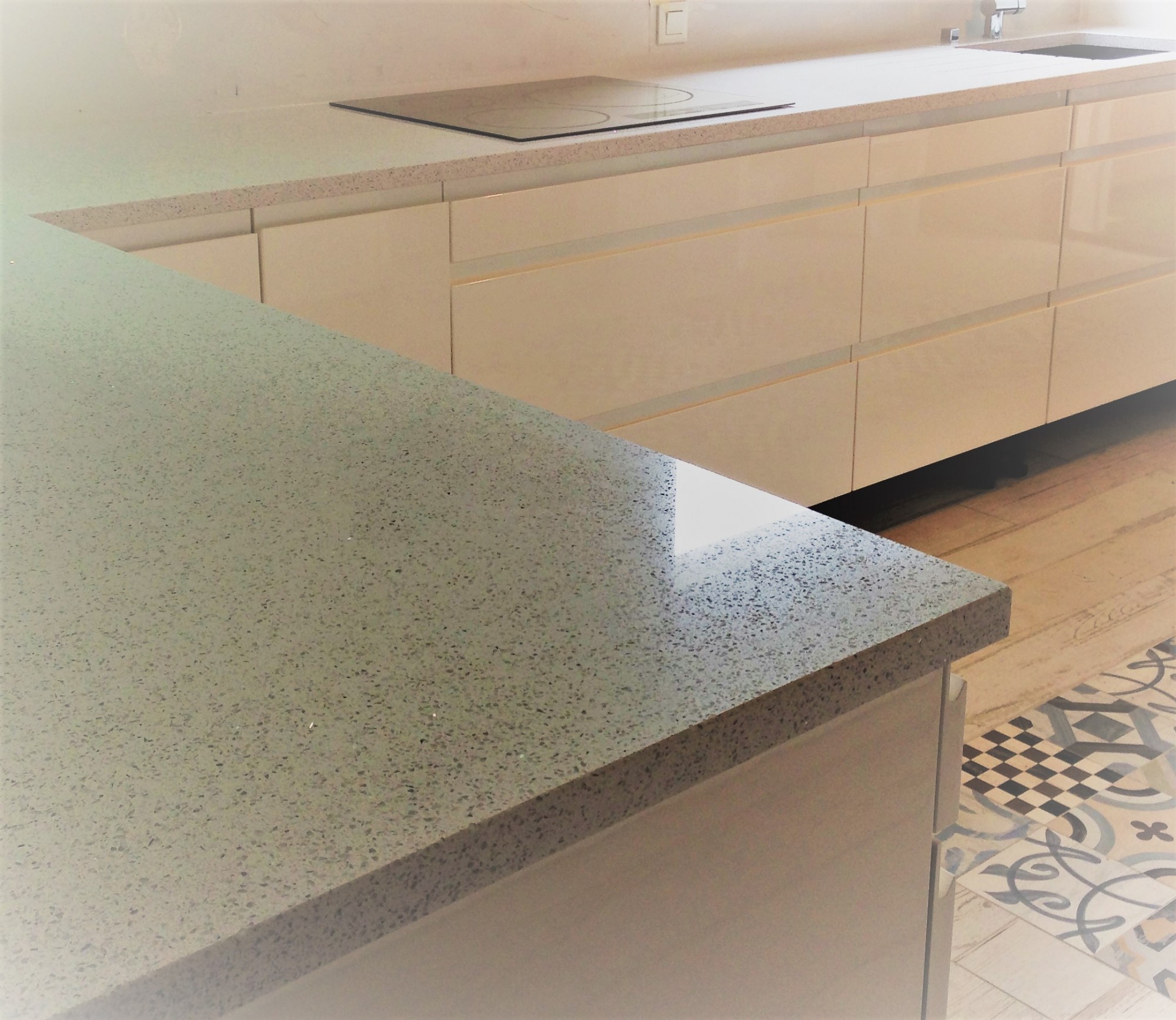 Le plan de travail Blanco Stellar est un quartz blanc avec des reflets brillants qui apportent de la luminosité et du charme à votre pièce. Il s'adapte à tous les styles de décoration, du plus classique au plus moderne, et se marie avec toutes les couleurs de meubles et de murs.