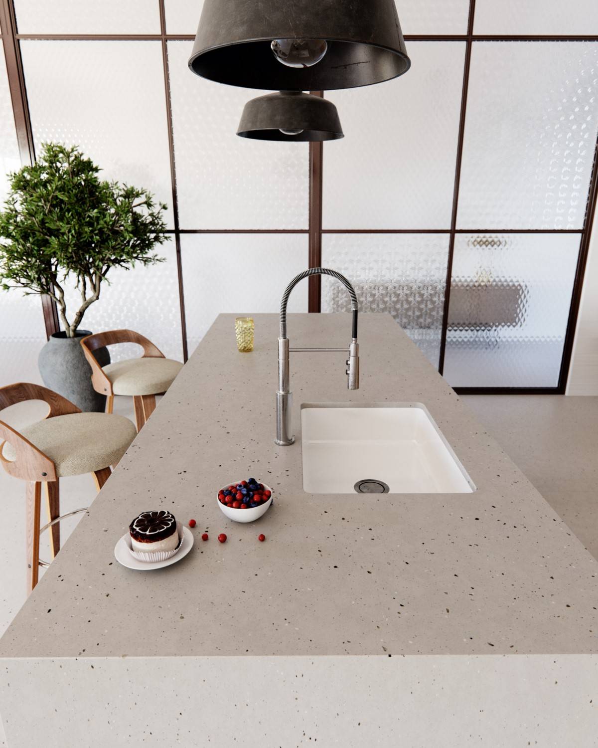 Le quartz concrète pulse est un coloris moderne et élégante pour les surfaces de cuisine, de salle de bains et de bureau.