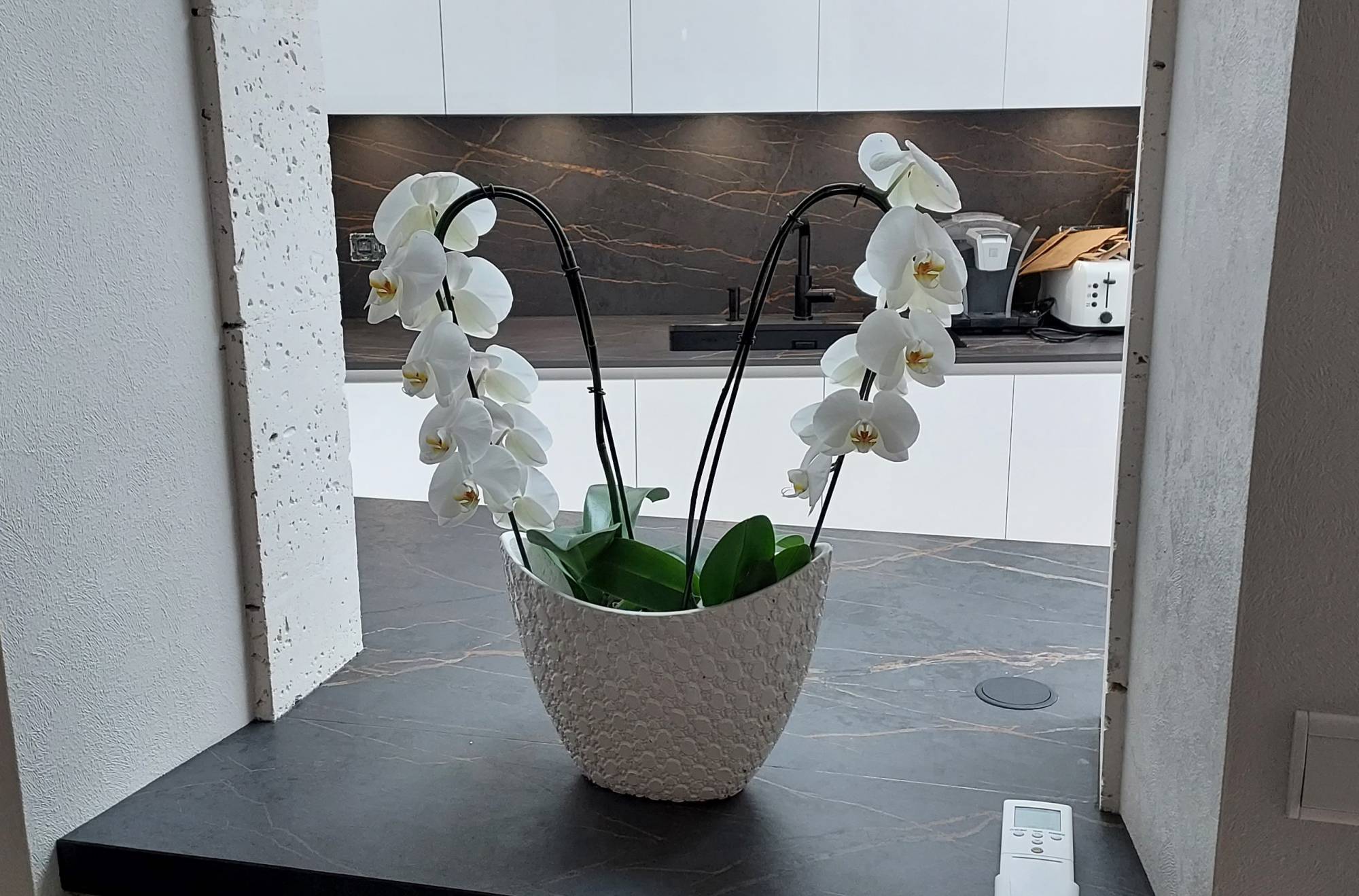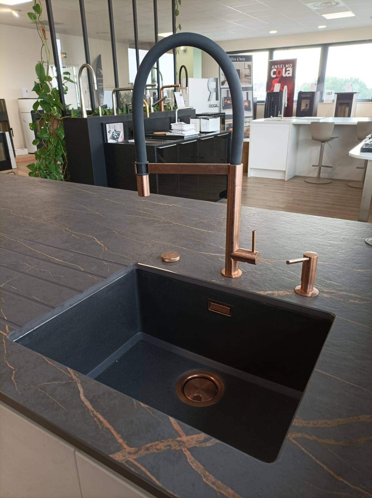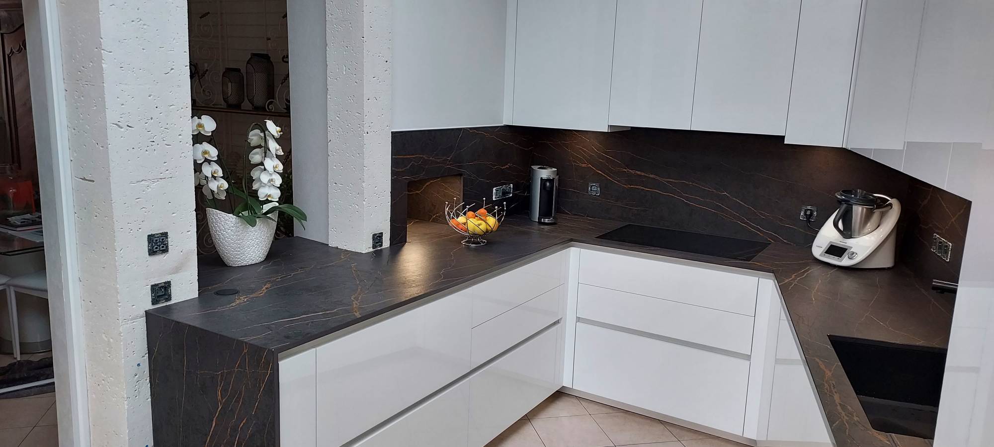Voici des photos de nos réalisations en Dekton LAURENT, plans e travail en céramique noir avec des veinages marrons. Ce coloris est disponible dans notre showroom de Biganos.