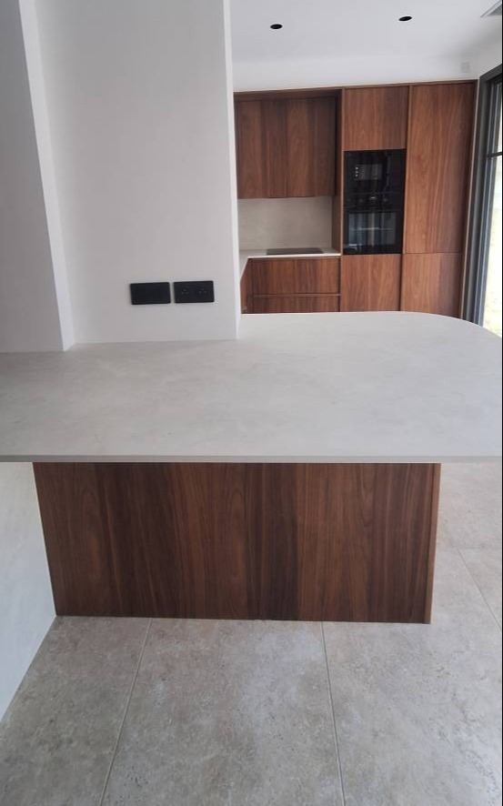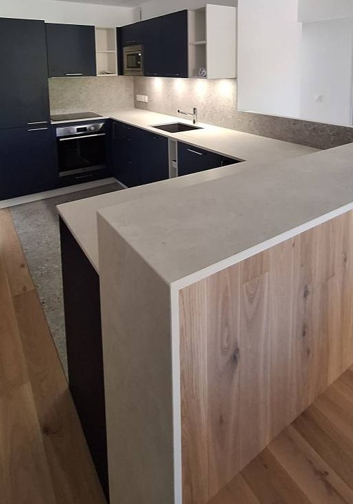 Le Dekton Sandik séduit par sa teinte crème clair, délicatement nuancée de gris minéral, qui évoque l’élégance naturelle des pierres fines. Son aspect soyeux et épuré crée une ambiance apaisante et raffinée, idéale en plan de travail, salle de bain, meuble ou extérieur.