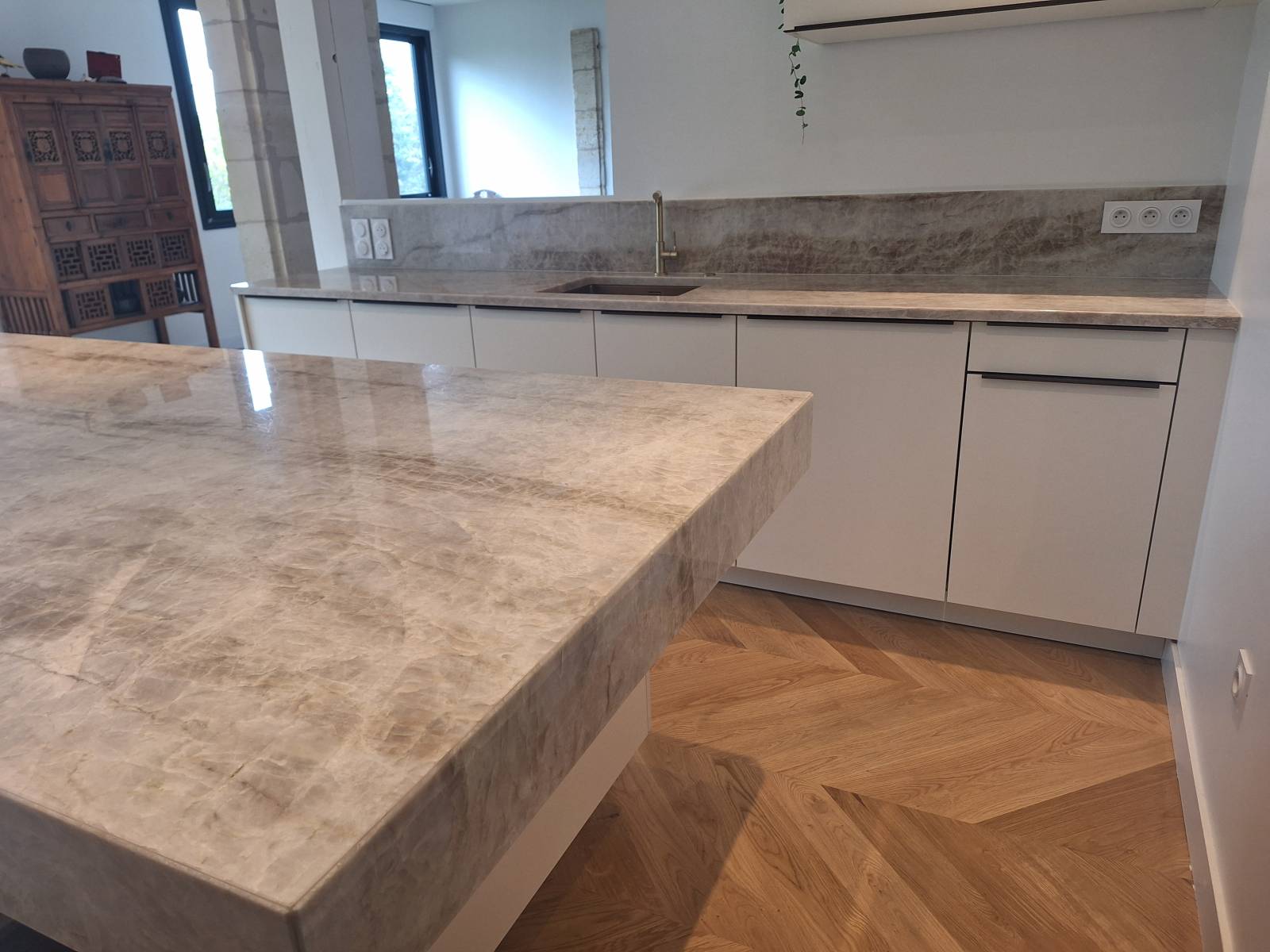 Découvrez l'élégance intemporelle du granit Taj Mahal à travers les réalisations des équipes de HM Déco. Située à Biganos, notre entreprise spécialisée dans la conception et l'installation de plans de travail sur mesure démontre, une fois de plus, son expertise avec des créations en granit Taj Mahal. Ce matériau d'exception, reconnu pour ses tons doux et ses veinages subtils, apporte une touche luxueuse et naturelle à tout espace.