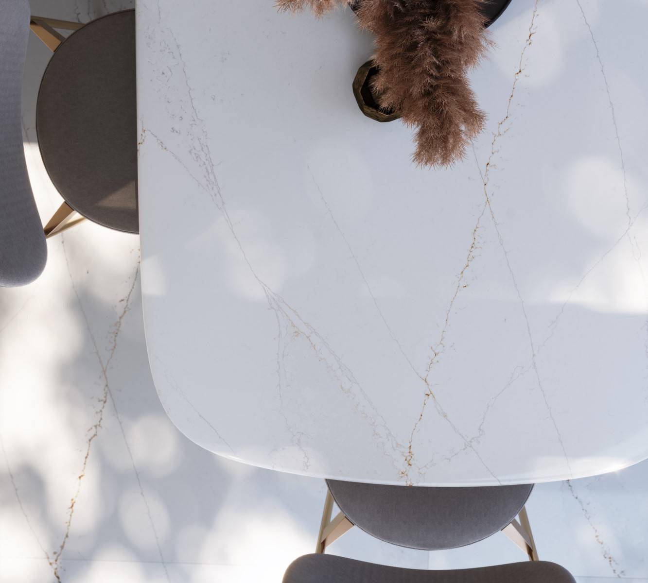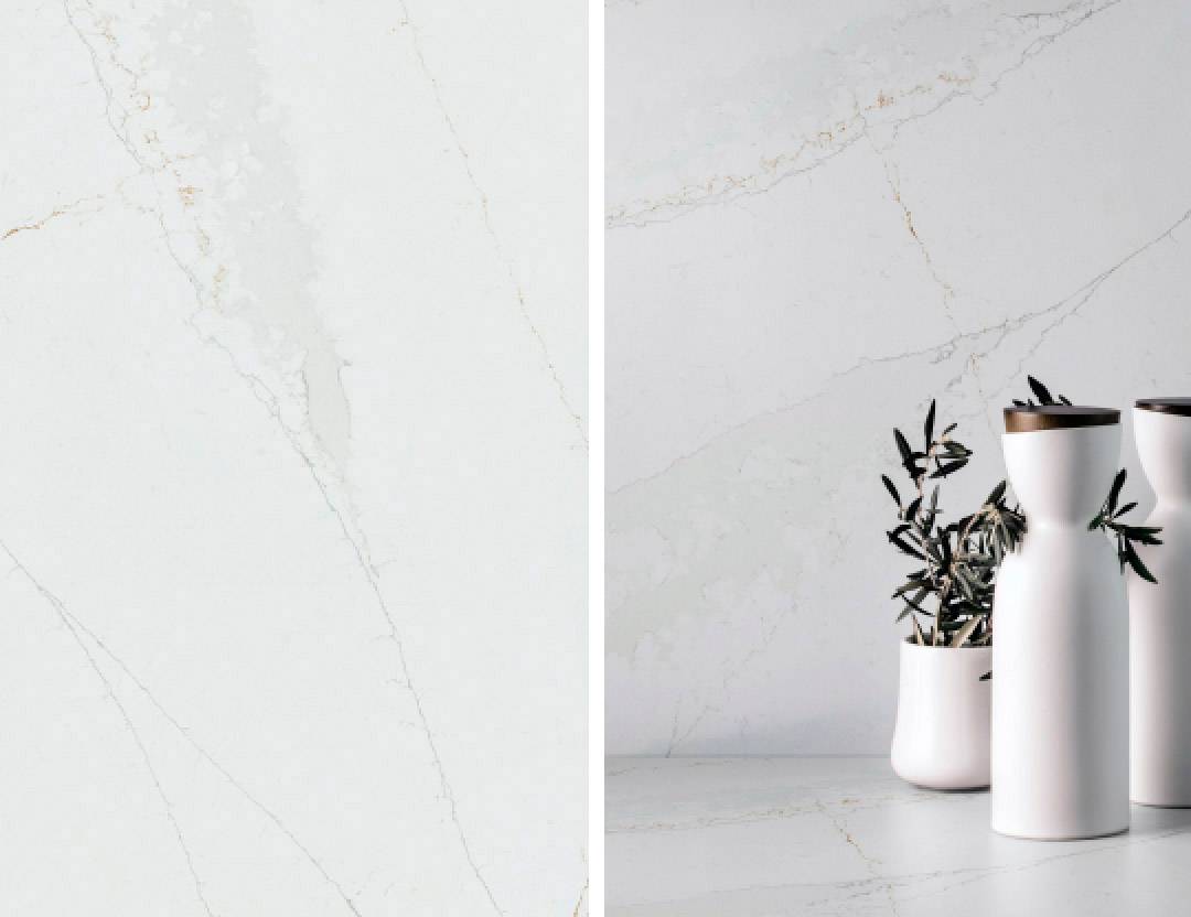 De teinte dominante blanche et accompagné d'un léger veinage gris et cuivre, ce quartz offre l'aspect du marbre.
