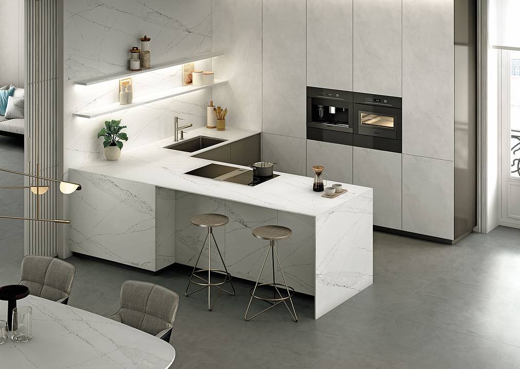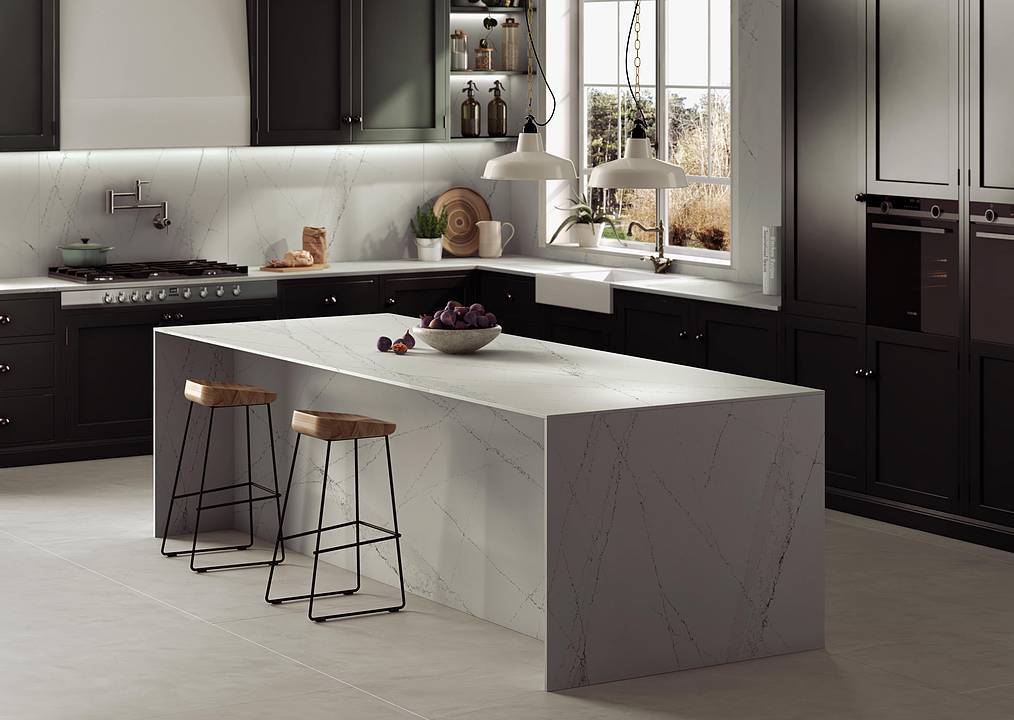 Disponible depuis 2021, ce coloris de Quartz est un blanc veiné de noir, qui se rapproche de la couleur du marbre tout en ayant les propriétés supérieures du Quartz. En effet, contrairement au marbre, il ne sera pas poreux et n'absorbera par conséquent pas les liquides qui pourraient rester dessus.