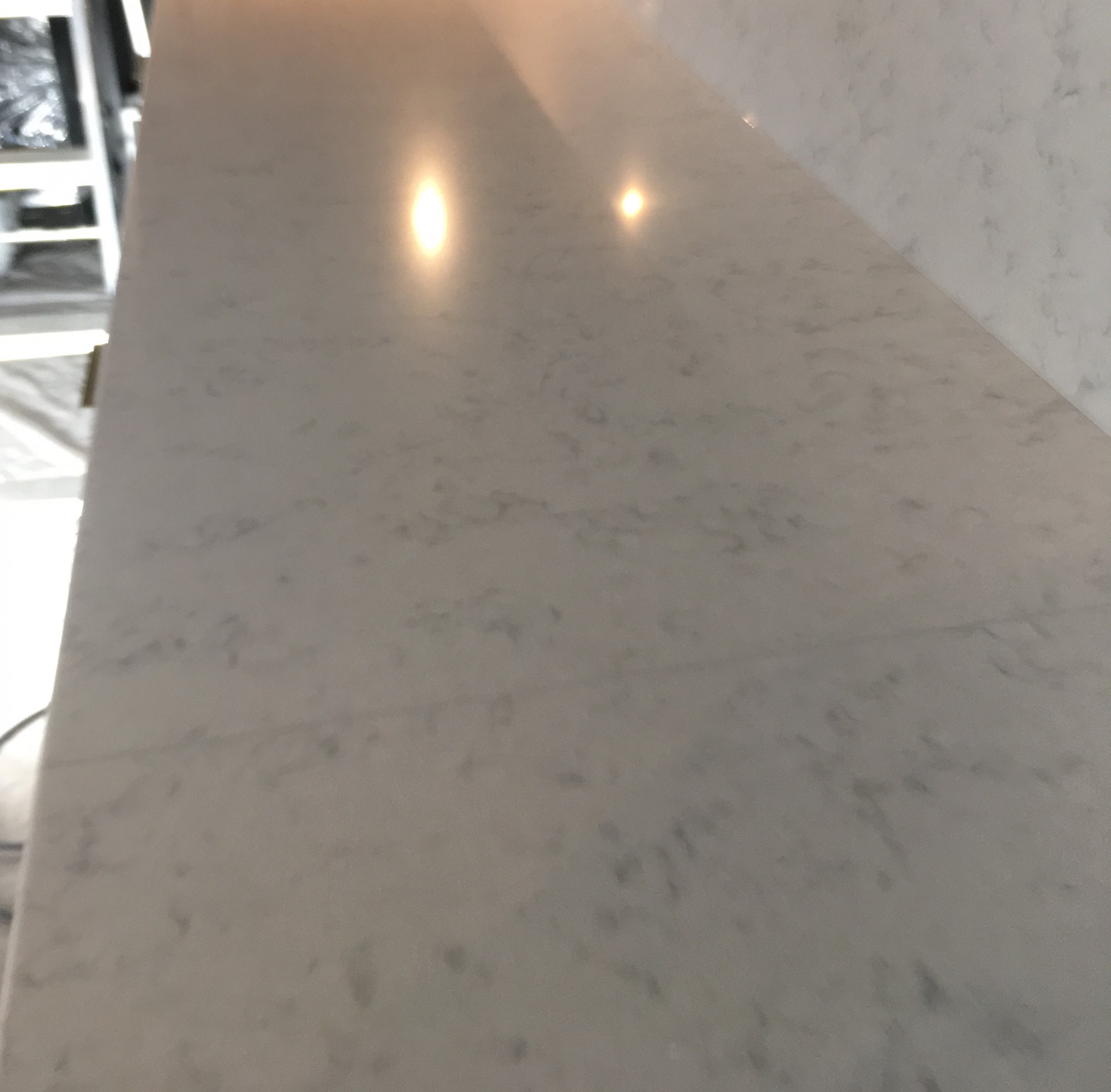 Le plan de travail Lagoon est un plan de travail en Quartz blanc mélé à de petits veinages gris .